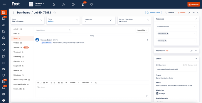 The Notes tab within Jobs streamlines communication, supporting both internal team collaboration and external messaging with tenants and vendors connected to the Job. Fyxt Notes include @mention functionality to enhance clarity and accountability.